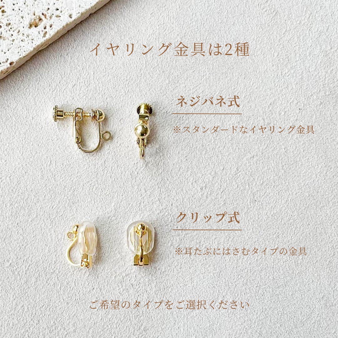 ※イヤリング金具に変更した場合、金具の素材はニッケルフリーメッキを施した真鍮製となります。